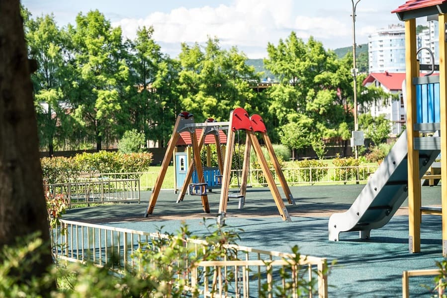 Открытый подогреваемый бассейн предлагает специально оборудованную детскую зону. В этой зоне есть небольшая «чаша» с глубиной 50 см, а также фонтан в форме грибочка.