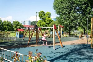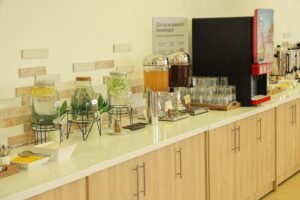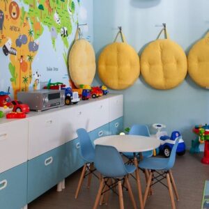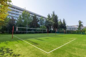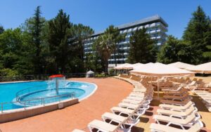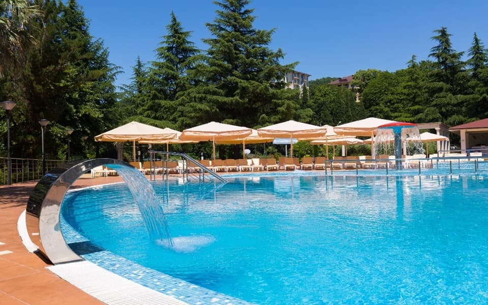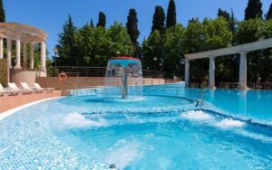 Открытый подогреваемый бассейн предлагает специально оборудованную детскую зону. В этой зоне есть небольшая «чаша» с глубиной 50 см, а также фонтан в форме грибочка.