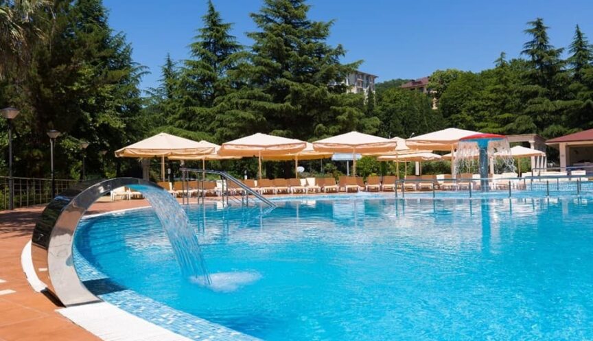 Открытый подогреваемый бассейн предлагает специально оборудованную детскую зону. В этой зоне есть небольшая «чаша» с глубиной 50 см, а также фонтан в форме грибочка.