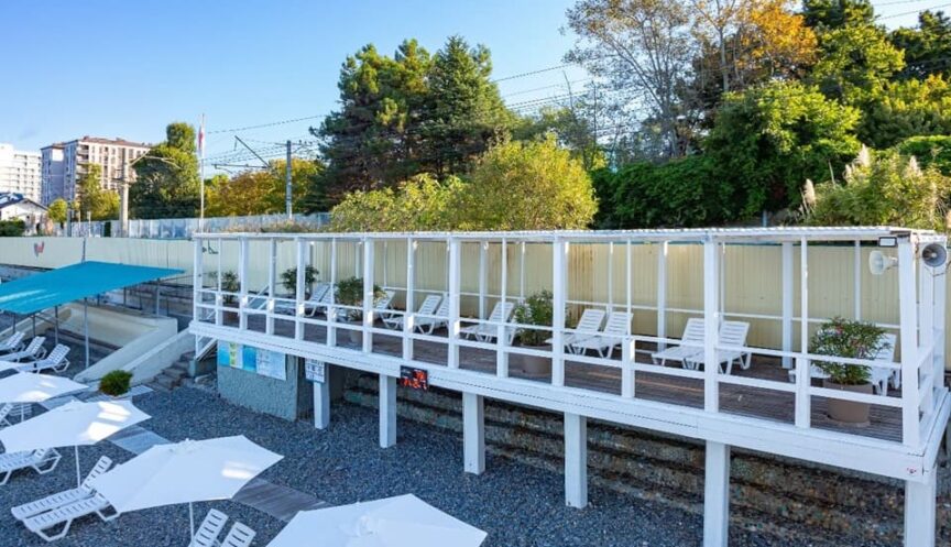 Для комфортного отдыха на пляже установлены шезлонги, зонтики от солнца и мелкая галька.